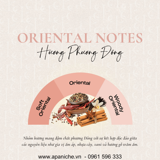 Nước hoa phương Đông thường nổi bật với sự ấm áp, quyến rũ và có chiều sâu. Chúng được cấu tạo từ những nguyên liệu nồng nàn như nhựa thơm (myrrh, benzoin), vani, đậu tonka, gỗ trầm, xạ hương, hổ phách hay các loại gia vị như quế, nhục đậu khấu. Không giống những nhóm hương nhẹ nhàng như citrus hay hoa cỏ, dòng hương Oriental thường để lại ấn tượng mạnh và mang nét sang trọng đặc trưng. Những lớp hương thường được xây dựng phức tạp, tạo nên cảm giác huyền bí và mê hoặc – một dấu ấn rất khó nhầm lẫn.